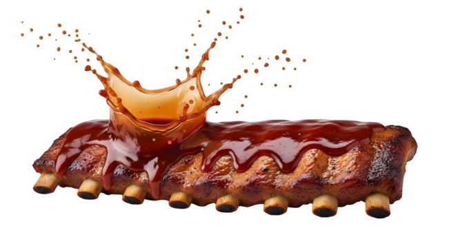 Tasty pork ribs drenched in bbq sauce splash action dynamic food shot