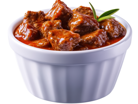 Bowl of tender meat drenched in rich sauce surrounded by fresh herbs and colorful vegetables on a rustic table isolated on a white background.