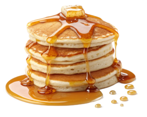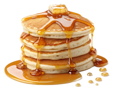 Delicious stack of fluffy pancakes drenched in golden syrup with melting butter isolated on transparent background