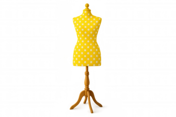 Yellow polka dot dress form on wooden stand, concept for fashion design, tailoring, vintage style and retail display