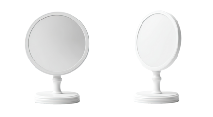 Two identical, white, oval hand mirrors on stands.  Simple, classic design.  Empty reflective surfaces