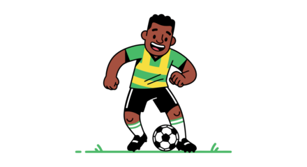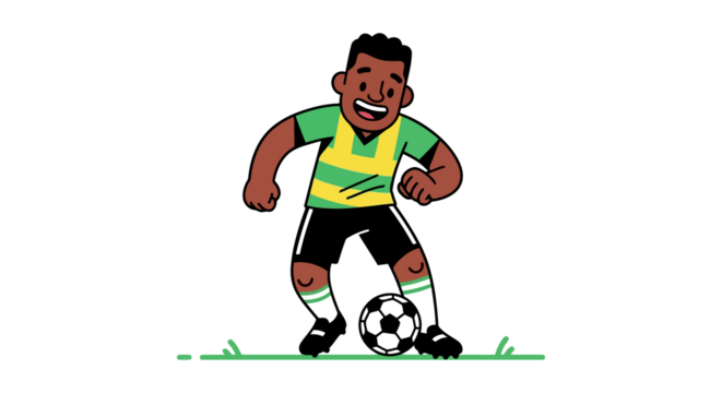 Joyful cartoon soccer player dribbling a ball with enthusiasm, sports illustration
