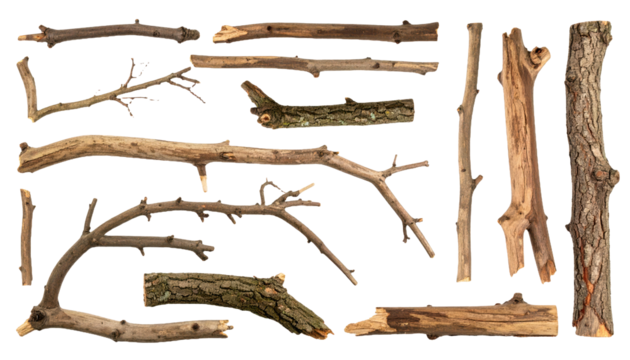 Close-up view of a cluster of fallen, dried leaves and twigs, arranged in a horizontal composition against a dark background.