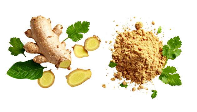 Fresh ginger root with leaves and ground ginger isolated on transparent background