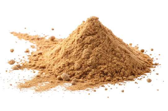 A pile of finely ground ginger powder with small clumps isolated on transparent background