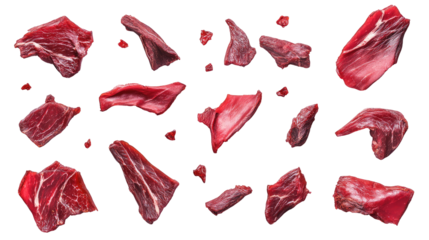 Flaying beef jerky featuring piles of dried meat isolated on a transparent white background for culinary exploration and snack ideas