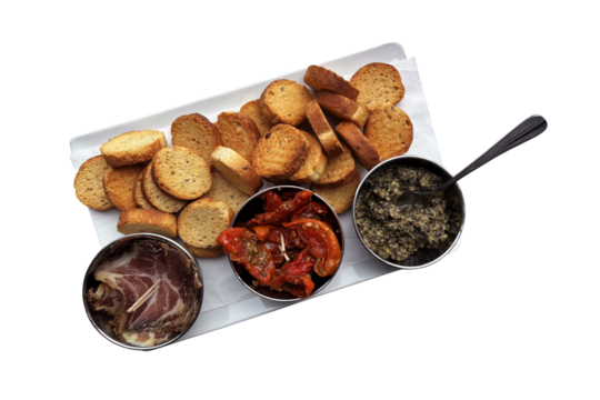 Starter dish with dried sweet tomatoes, black olive tapenade, meat slices and croutons in three bowls on rectangular plate, rustic traditional appetizer of French cuisine, restaurant menu