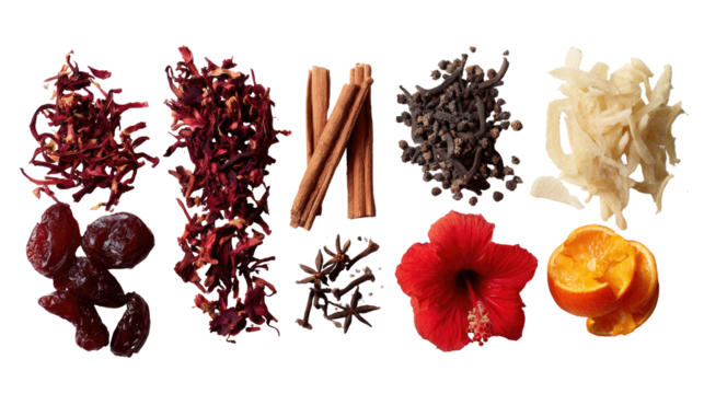 Collection of natural winter and Christmas elements, including dried orange slices, cinnamon sticks, pine cones, star anise, and spruce branches isolated on a transparent background, PNG. High Res.