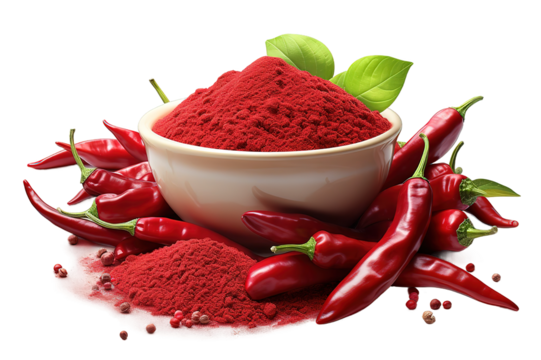Bowl with red chili powder on  transparent PNG background. Ai generative.