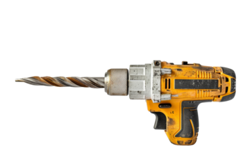 Power drill showcases its yellow and design, fitted with a drill bit against a stark .