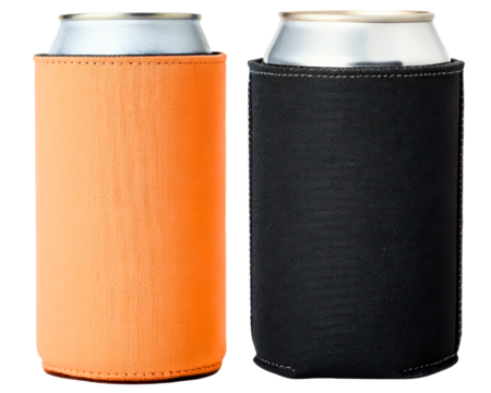 Orange and black neoprene beverage can insulators on a transparent background
