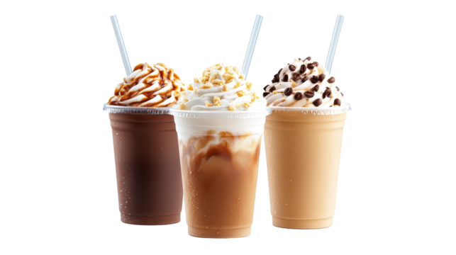 Three delightful coffee creations in plastic cups, a visual journey through coffee diversity