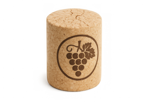 Wine cork showing grape emblem, natural brown texture visible against transparent backdrop, revealing traditional bottling element
