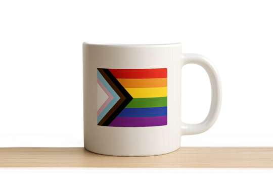 Isolated ceramic mug with black triquetra emblem for coffee, tea, or other beverage