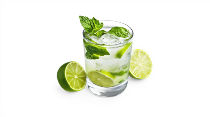 Cold mojito drink, glass of alcohol isolated over white background, fresh mint and lime fruit slice, food still life, party and holidays celebration