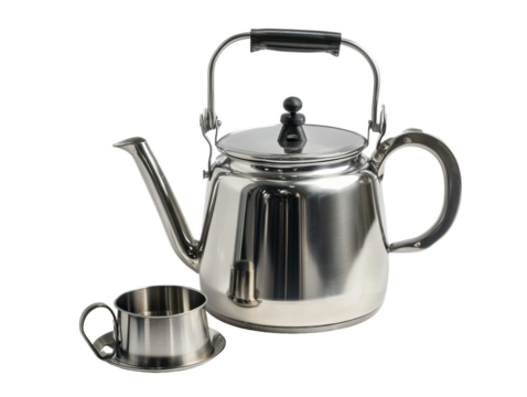 Silver tea kettle sits on a white background with a cup next to it. The kettle is large and shiny, and the cup is smaller and more delicate. Concept of warmth and comfort, as the tea kettle