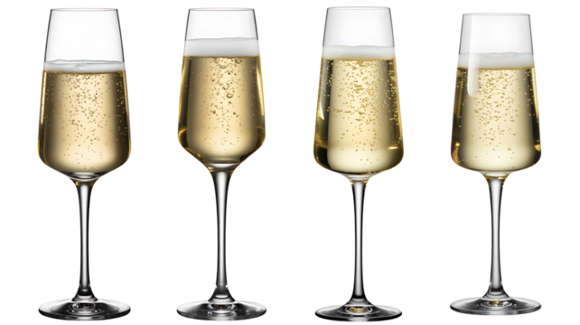 Four champagne flutes filled with bubbly champagne isolated on transparent background