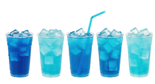 Five blue and aqua drinks with ice cubes isolated on transparent background