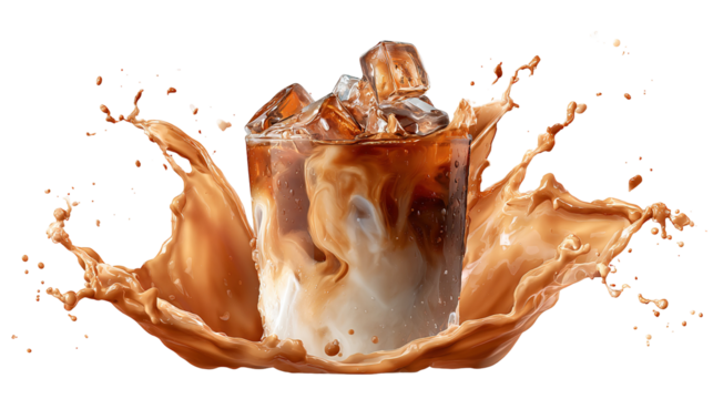 Refreshing iced coffee with milk splash captured in motion, showing freshness, energy, and a delicious lifestyle drink in a minimal aesthetic background