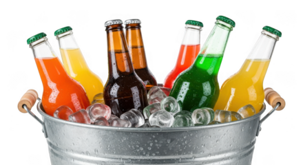 A metal bucket filled with ice and various colorful soda bottles on transparent background
