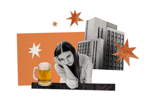 Composite photo collage of drunk sot girl drinker alcohol problem glass beer restaurant building pub isolated on painted background