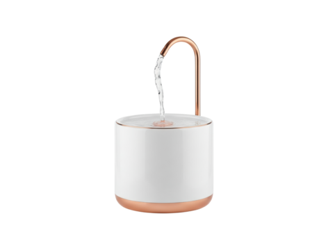 Modern white and copper pet fountain with flowing water from a curved spout provides fresh, circulating hydration for cats and dogs in a sleek, minimalist design