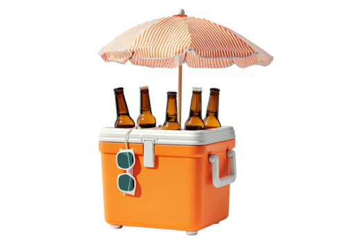 A Sunny Day Essentials - Yellow Cooler, Beer Bottles, Sunglasses, Umbrella on a White or Clear Surface PNG Transparent Background.