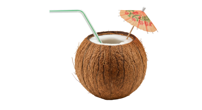 A coconut filled with refreshing liquid, topped with a colorful umbrella and a straw, offering a tropical drink experience.