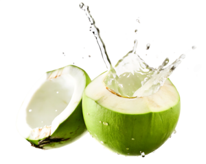 Fresh green coconut with water splashing PNG isolated on transparent background, tropical fruit refreshment for summer drink and healthy lifestyle