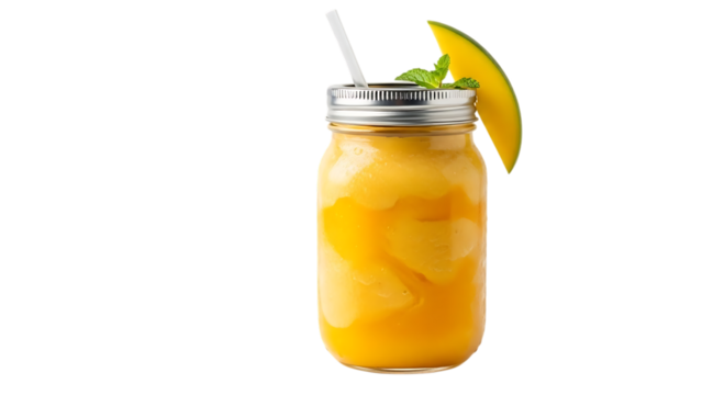 Refreshing mango smoothie in mason jar with fruit and mint