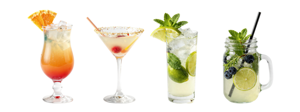 Photograph of four colorful drinks: curvy orange gradient glass, clear martini with cherry and sprinkles, tall glass with lime and mint, mason jar with lemon, mint, and blackberries.