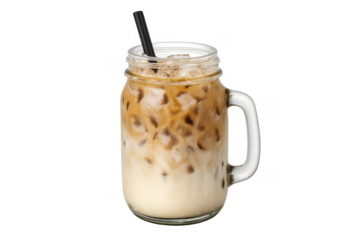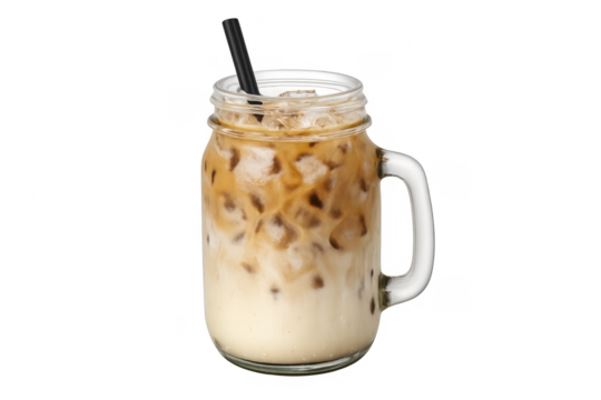 Iced coffee with milk in mason jar, transparent background