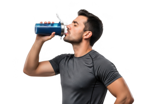 Man drinking from a blue water bottle with a straw isolated on transparent background