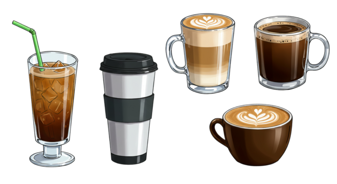 Assorted Coffee Drinks Illustration Featuring Latte Cappuccino Iced Coffee and More