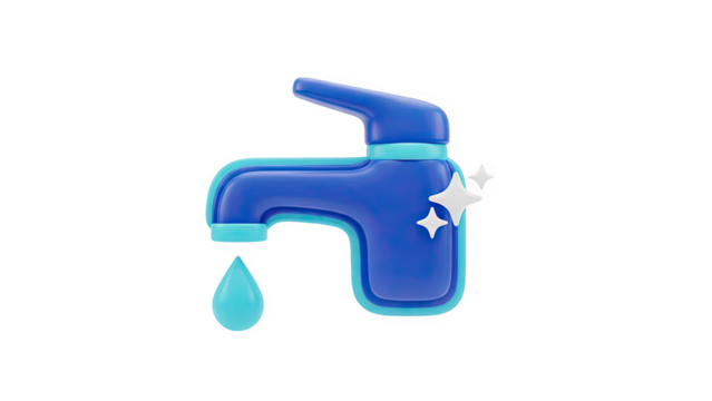 3D Blue Faucet with Dripping Water and Sparkles Icon on transparent background