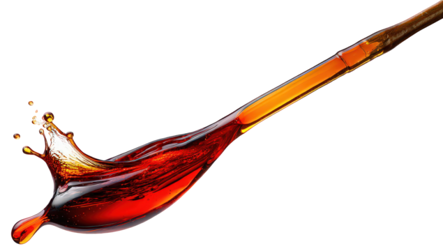A shiny, rose gold liquid with glitter drips down against a transparent background. The texture appears smooth and glossy, ideal for cosmetic or artistic use.