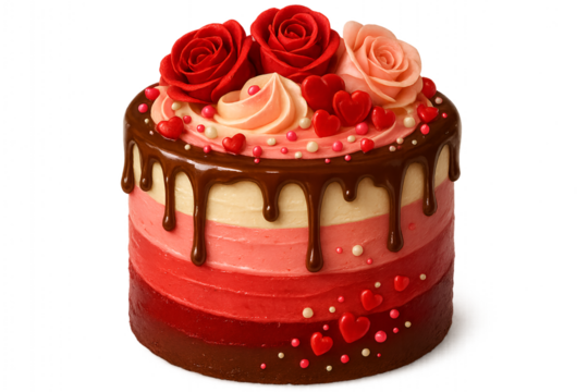 Romantic Valentines Day cake with chocolate drip and red roses 3D illustration isolated on white