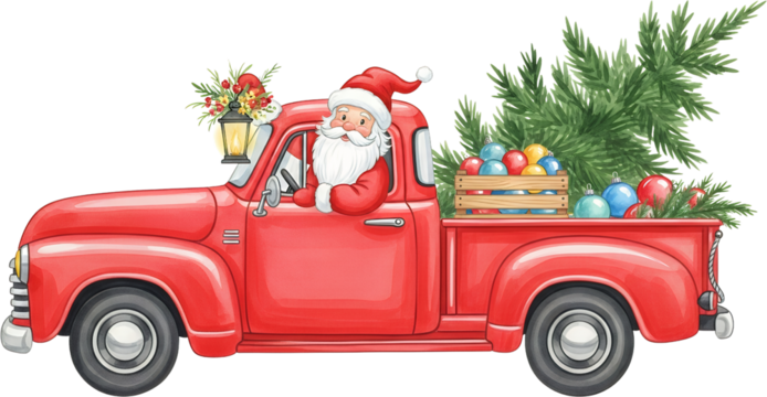 A smiling Santa Claus drives a red vintage pickup truck laden with a Christmas tree and festive ornaments a lantern with berries adorning the hood Red Truck