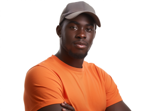 Confident young black man in orange shirt and cap exudes determination. Volunteer's posture and expression convey readiness to tackle community challenges with vigor.