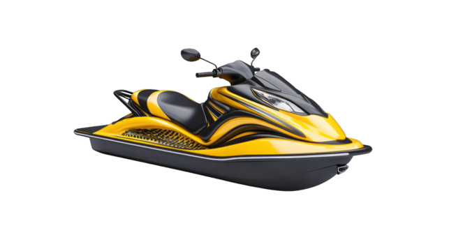 A yellow and black jet ski is parked on a white background