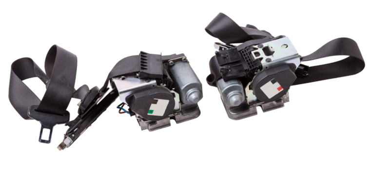 Spare part and interior element black seat belt from a car on a white isolated background. Auto service industry.