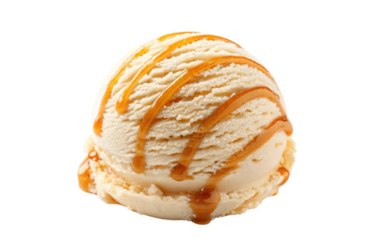 Indulgent vanilla ice cream scoop drizzled with rich caramel sauce, a perfect sweet treat for any occasion.