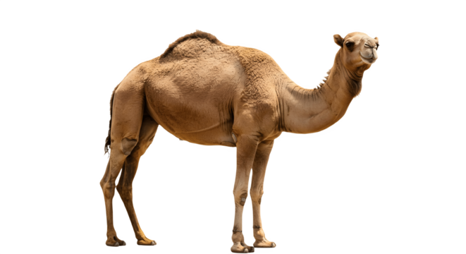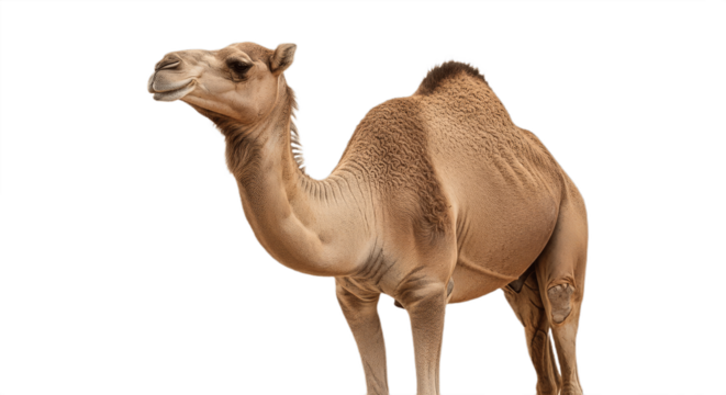 A full body shot of a dromedary camel standing on a white background in a studio setting looking right on transparent background