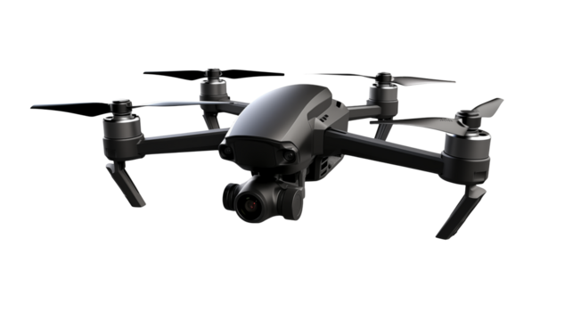 Close-up view of a modern quadcopter drone with a camera, featuring four rotors and a sleek design on transparent background.