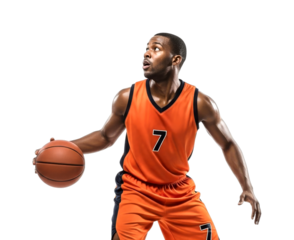 African American basketball player dribbles the ball with intense focus, showcasing athletic skill and determination during a competitive game.