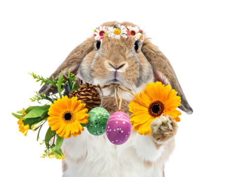 A fluffy, brown rabbit with drooping ears, wearing a floral crown and holding flowers and painted Easter eggs. It's against a pure black background