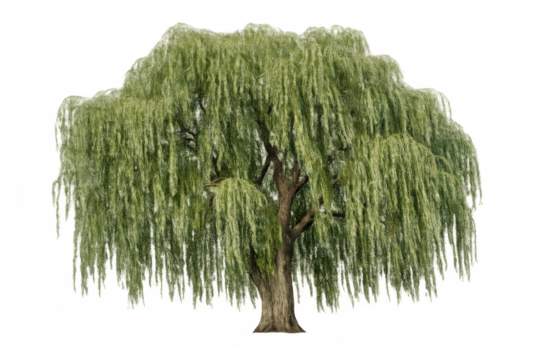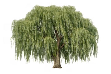 Weeping willow tree with green foliage and drooping branches on a transparent background, identifying nature and botany concepts
