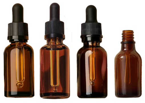 Assortment of cosmetic dropper bottles on transparent background