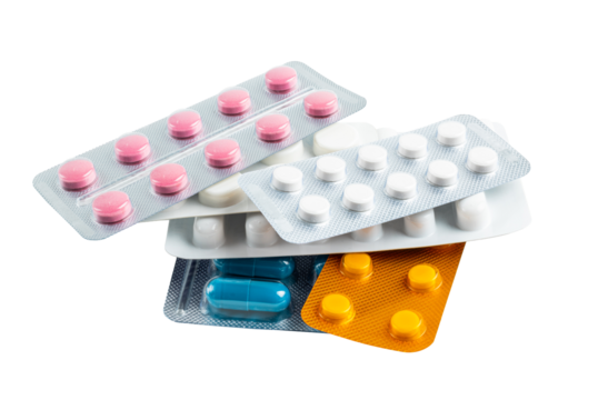Stack of blister packs with round pills on a white isolated background