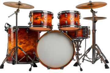 Professional drum set with cymbals, brown finish, isolated on white background. PNG transparent.